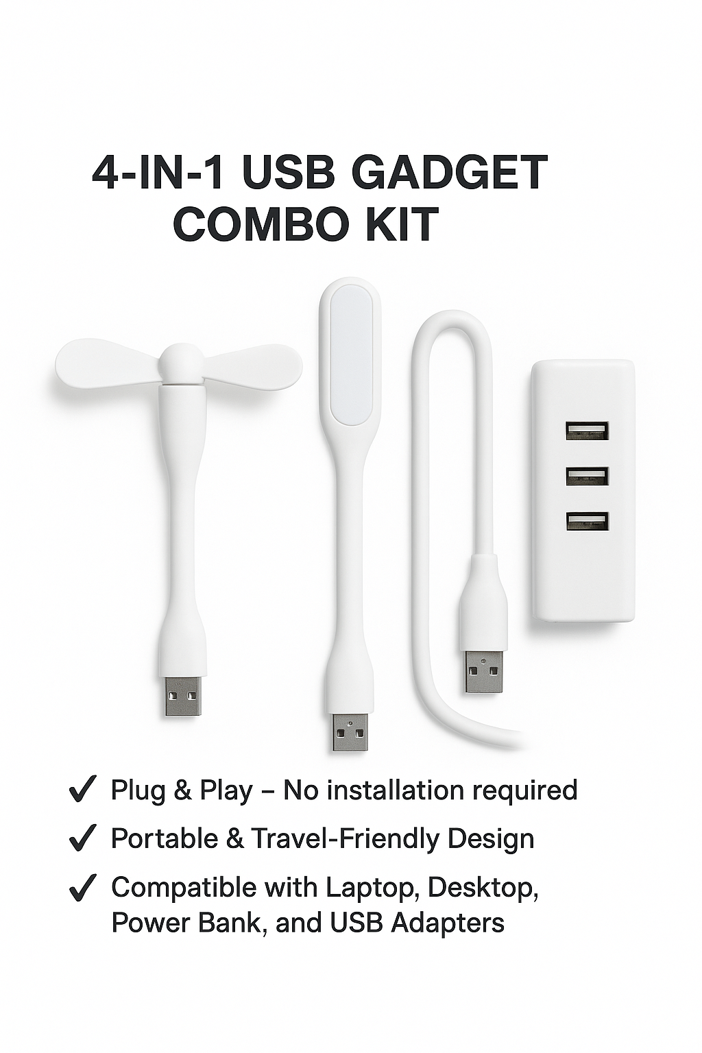 Upgrade your daily tech experience with this 4-in-1 USB Gadget Combo Kit, designed for convenience, portability, and everyday use. This versatile set includes: