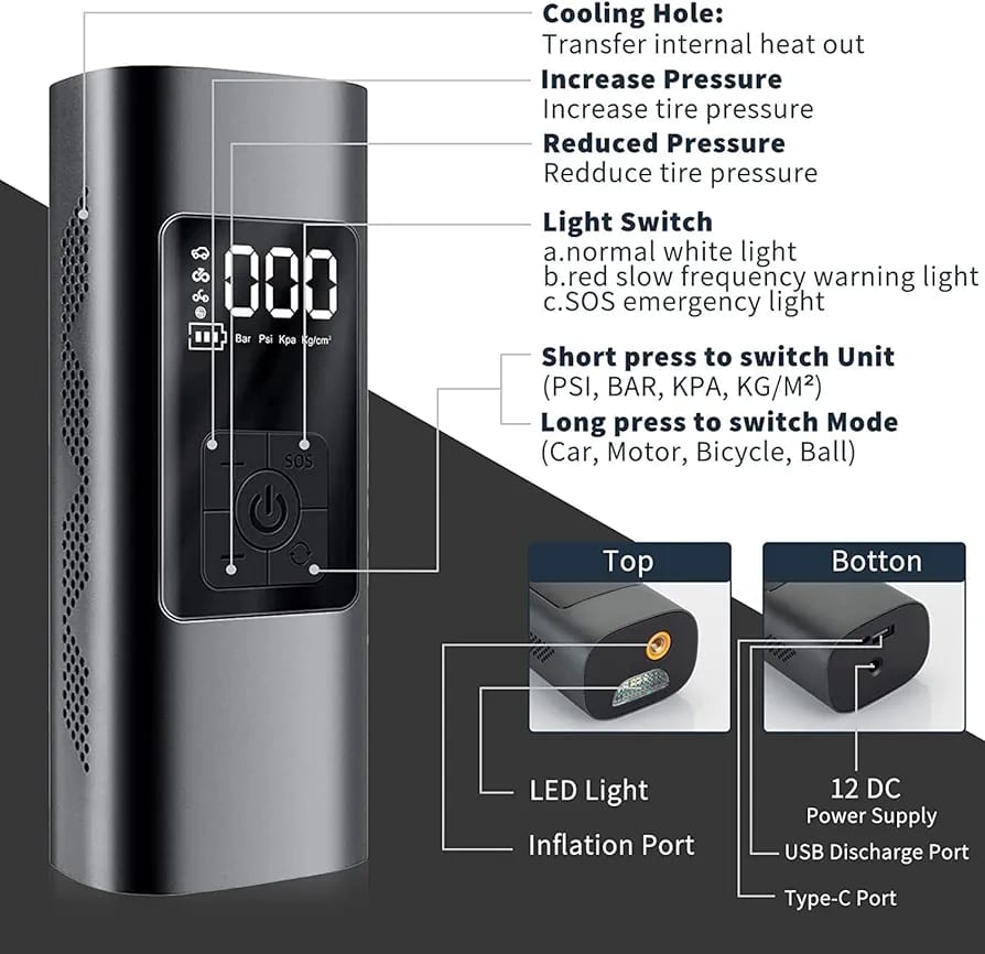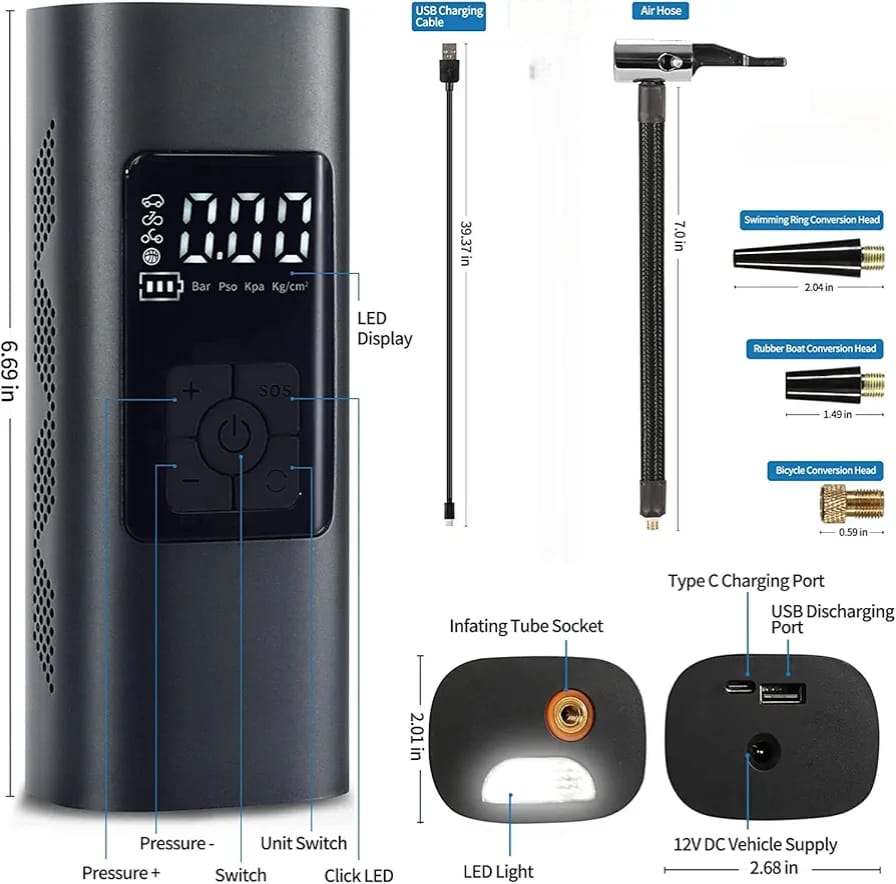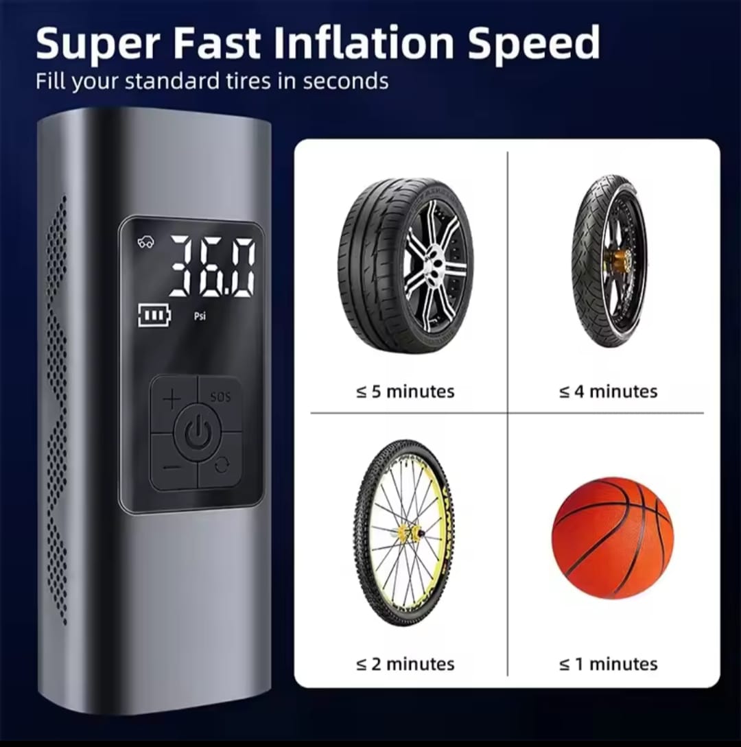 Stay powered up and pumped up wherever you go with our Air Compressor Power Bank – a compact yet powerful gadget that combines two must-have tools in one sleek design. Whether you're on a road trip, facing an emergency, or just need to inflate a tire or charge your phone, this device has you covered!