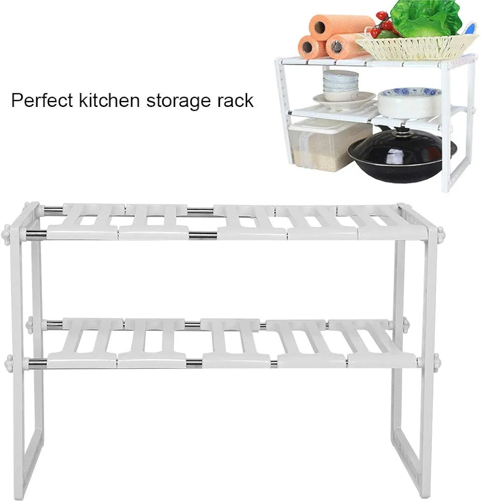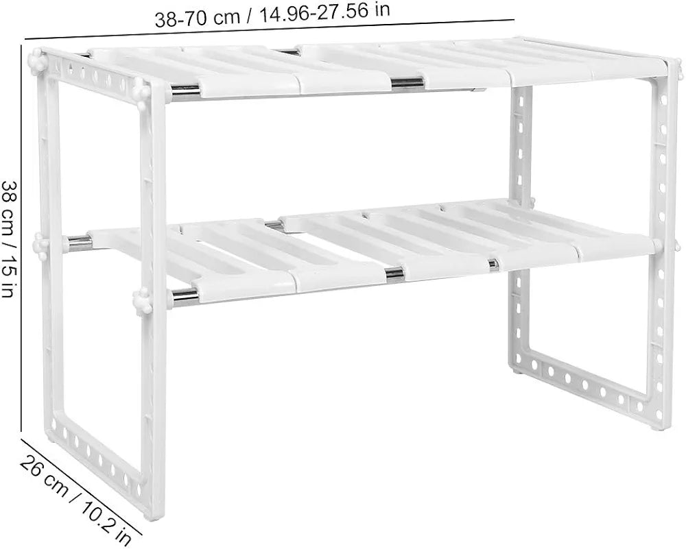 Extendable Under Sink Rack (White)More often than not, we find it difficult to keep the space under our sink organized. This Expandable Under sink Storage Shelf Organizer Space Saver solution is suitable for almost any under sink area. The adjustable shelves which may be snapped on or off, to allow for building around the pipes. It is good idea for saving space in the kitchen.A Home For All Your Under Sink ItemsThe unique one of a kind under sink organizer creates usable storage space. Solid metal piping and durable plastic shelves are modular and can be arranged to fit around any under sink pipe configuration adding desirable shelf space! Easy to install, no tools needed. Finally have room for all your cleaning supplies and toiletries. This Sink can be extend from 50cm to 70cm length.FeaturesRack can be extended to hold more itemsEasy installationRemovable parts for easy cleaning or easy storageSpecificationsProduct Name: Adjustable Kitchen Rack (Pool Space Arrangements Frame)Applicable Space: Kitchen, Bathroom, BedroomInstallation Type: Floor, free standingNo. of Tiers: 2Material: ABS PlasticW x H: 26 x 37.5cmLength Range: 50 to 70cmColour: WhiteBox Contents:2 x Extendable stainless steel pole2 x Plastic Rack tier2 x Plastic stand frame8 x Plastic fastener caps