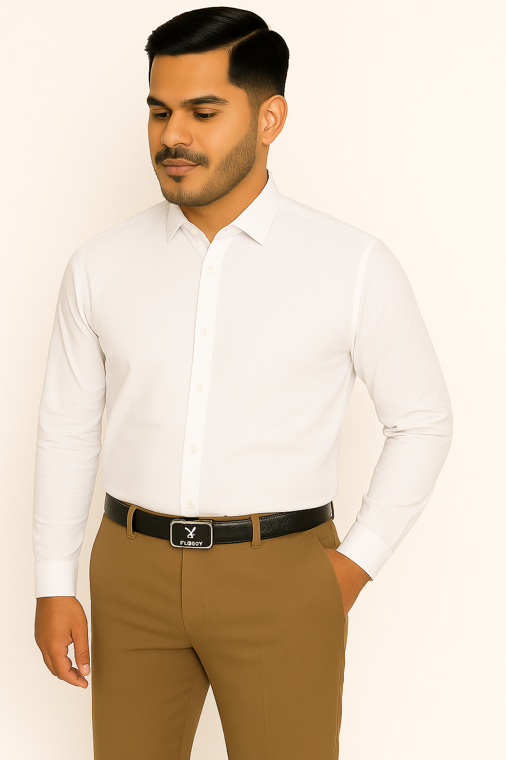 The belt is elegantly paired with a crisp white shirt and khaki pants in the model image, showcasing its versatility and timeless appeal. Its glossy black buckle adds a touch of class to your outfit, making it ideal for both formal events and daily wear. The leather strap is not only durable but also flexible enough for all-day comfort.