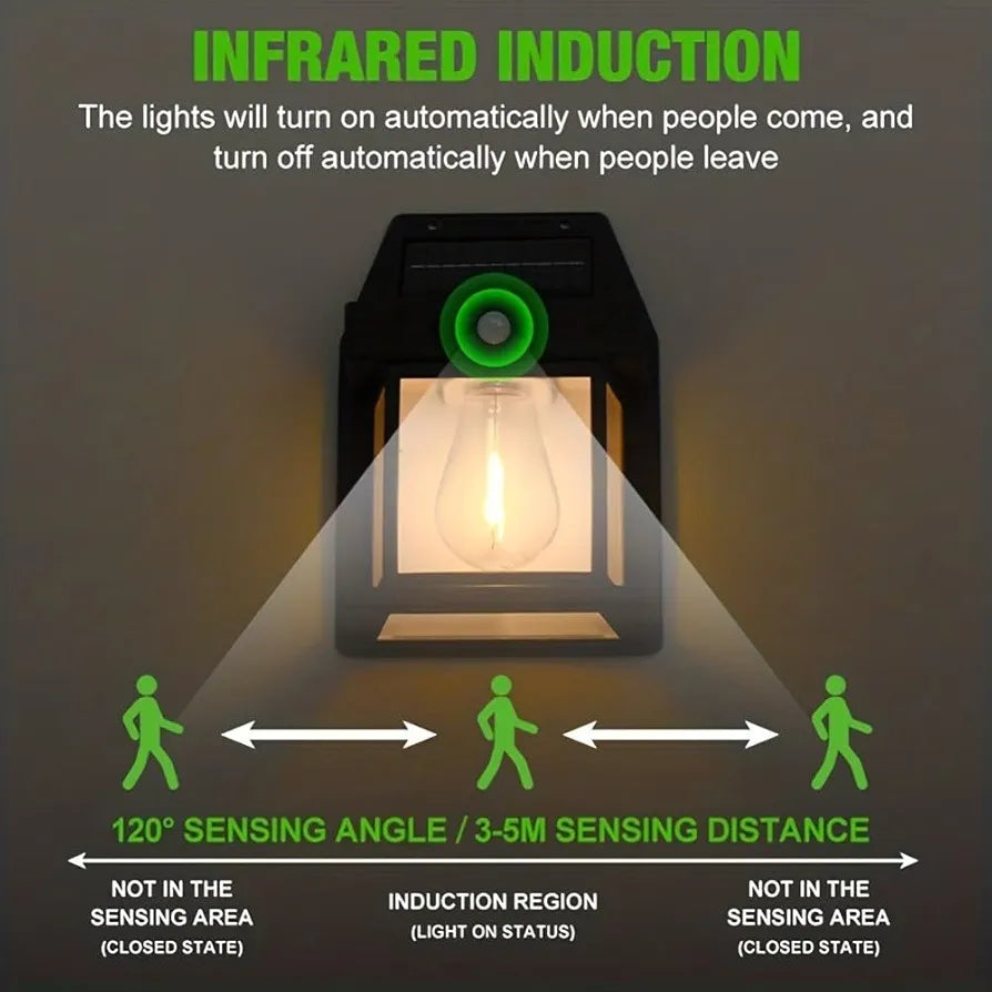 - 【3 Motion Sensor】The solar wall light has a built-in intelligent motion sensor that sensitively detects motion within a 120° angle within 8 meters. Press the on/off to switch 3 different modes: 1.When motion is detected, the wall light will turn on to 100%, and will be off after the movement leavs for 15s. 2. When motion is detected, it will turn on to 100%, the solar wall light will change to 50% brightness after the movement leaves for 15s. 3. Always keep 50% low brightness mode all night.