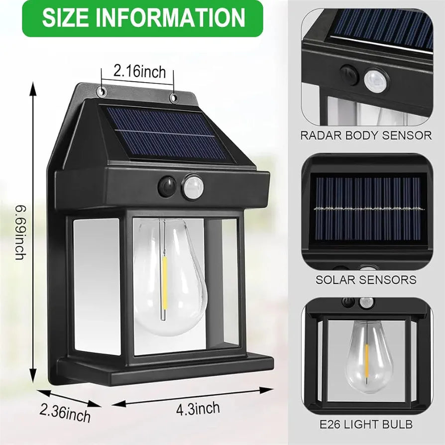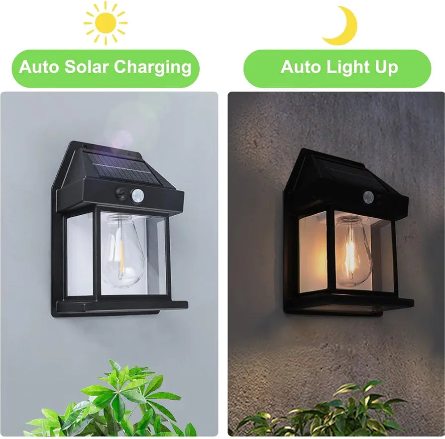 - 【Solar Wall Lantern Outdoor Lights】Outdoor Solar Porch Lights can be used as a wall sconce for porches, decks, patios, garage doorways and more. A solar panel is built in to quickly absorb sunlight for charging, and the battery is a large capacity of 1800mAh. Place the solar light in direct sunlight to fully charge the batteries.