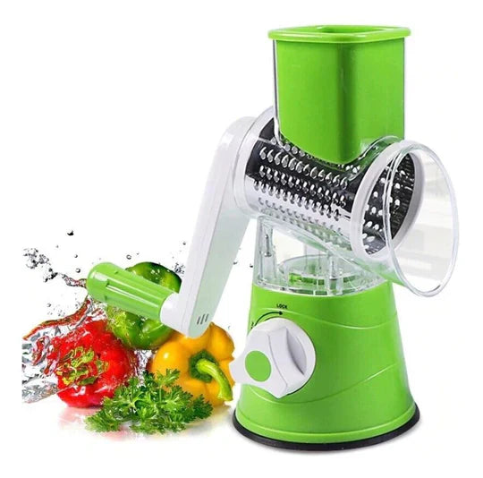Tabletop Drum Grater with 3 Round Stainless Steel Blades for Manual Hand Speedy Mandolin Slicing. It is a rotary grater or a mandolin slicer. It is simple to set up, operate, and clean. a necessary kitchen appliance! Simple to Setup Set the base down on a nice, flat countertop. Install the dispenser for food chopping. Install the rotating handle and the drum blade. Simple to Use Put the food in the dispenser's food hopper. With one hand, push the food down, and the other, turn the crank handle. The last amount of food should be placed on top of the food pusher. Once the remaining food is in the pusher, rotate the crank handle with one hand while applying pressure with the other.