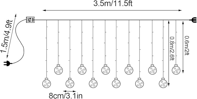 - š” Size: Curtain lights with bulb design, measures 11.5ft/3.5m in length. The size of each bulb is 3.1in/8cm, be full of vintage atmosphere.